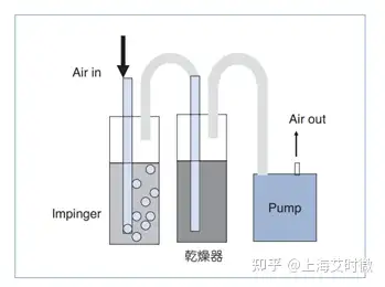 以事前校正之充电式定流速泵连接内装吸收液之冲击瓶 (impinger,如图 1 所示),于一定时间内收集可溶于吸收液内之 AMC,采样总体积可由采样泵读出,分析结果为采样期间内之平均值。