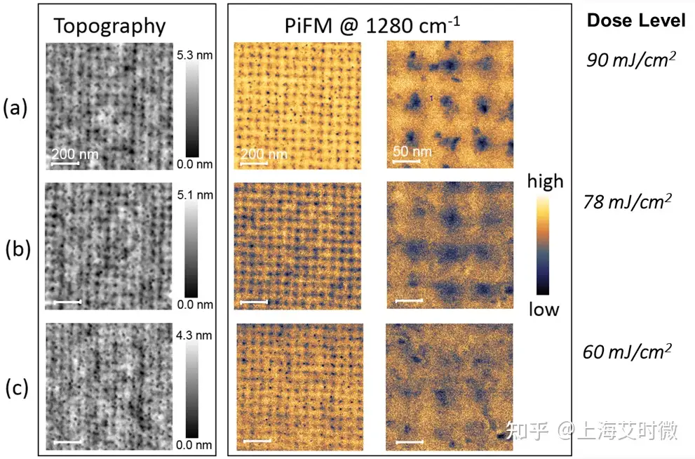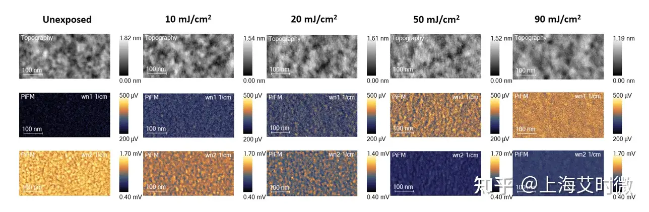单纯通过AFM形貌变化来比较剂量的曝光效果是非常困难的,PiFM不受形貌的影响,可以清楚地表明60mJ/cm2的剂量是不够的,进而来进一步分析合适的曝光剂量。