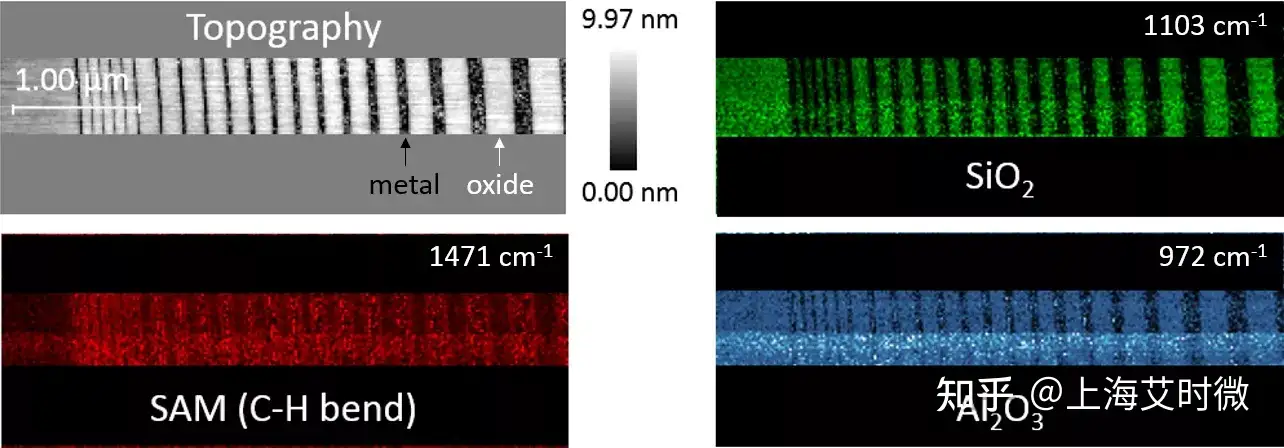 有机自组装单层(SAM)充当掩模以促进或抑制选定区域中的原子层沉积。在下面的案例中,SAM选择性地抑制金属区域沉积,并允许氧化铝优先沉积在暴露的氧化物区域上。SiO2、SAM 和 Al2O3 分别对应1103cm-1、1471cm-1和 972 cm-1 处的成像。尽管SAM和氧化铝不是局部的,在较低和较高浓度的区域仍然可以看到对比。