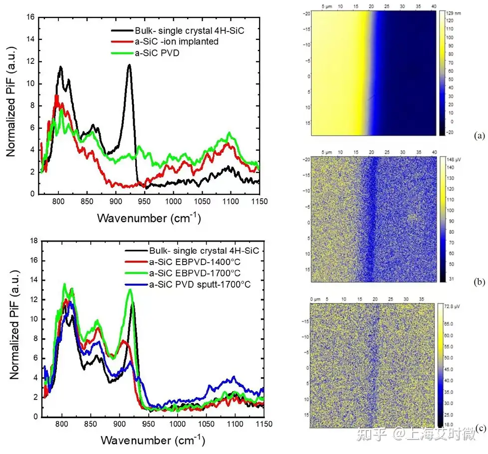 利用红外光诱导力显微镜(IR PiFM)对于退火前后的SiC layer的结晶度进行光谱采集与成像,有别于拉曼光谱(Raman)微米级的空间分辨率,IR PiFM的空间分辨率可达10 nm以下,并且也是无损检测。922 cm-1为SiC晶体的声子振动频率,可以用作为判断结晶度的特征峰。PiFM结果显示EB+1700°C后的SiC layer有着比4H-SiC基底更高的结晶度,此结果与Raman光谱表征结果相匹配。