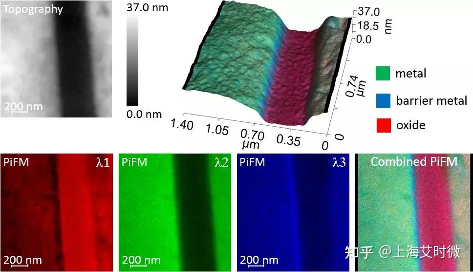 经过化学机械抛光(CMP)的样品通过PiFM成像可以区分不同区域。虽然金属不是红外活性的,但它们可以通过不同波长的介电常数来识别。在下图中,PiFM结果区分了金属,阻挡层金属和氧化物区域。
