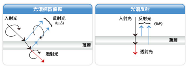 光谱椭圆偏振仪 (SE) 和光谱反射仪 (SR) 都是利用分析反射光确定电介质,半导体,和金属薄膜的厚度和 折射率。 两者的主要区别在于椭偏仪测量小角度从薄膜反射的光, 而光谱反射仪测量从薄膜垂直反射的光。光谱反射仪测量的是垂直光,它忽略偏振效应 (绝大多数薄膜都是旋转对称)。 因为不涉及任何移动设备,光谱反射仪成为简单低成本的仪器。光谱反射仪可以很容易整合加入更强大透光率分析。光谱反射仪通常是薄膜厚度超过10um的首选,而椭偏仪侧重薄于10nm的膜厚。在10nm到10um厚度之间,两种技术都可用。 而且具有快速,简便,成本低特点的光谱反射仪通常是更好的选择。