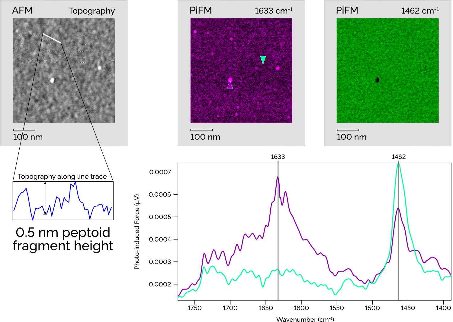 PiFM 化学图谱能够检测到仅比周围材料高 0.5 nm 的类肽片段!扫描尺寸:500 nm × 500 nm × 1.7 nm。