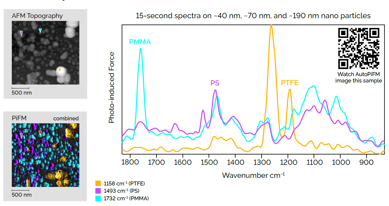 光诱导力显微镜可以对纳米级缺陷的尺寸和化学成分进行测量与分类。示例形貌图显示缺陷的大小约为40-200 nm,可以用不同颜色标记PTFE、PMMA和PS颗粒。