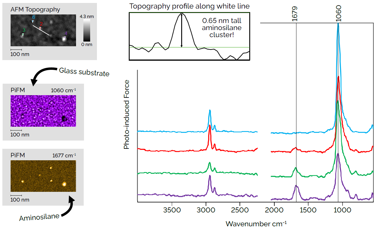 氨基硅烷单层膜是表面功能化的常用材料。该颗粒最薄约0.65nm,氨基硅烷峰在1677 cm−1处的强度随着厚度增加而增强,同理,位于氨基硅烷簇下方的1060 cm−1 处的峰值强度随厚度增加而减弱。